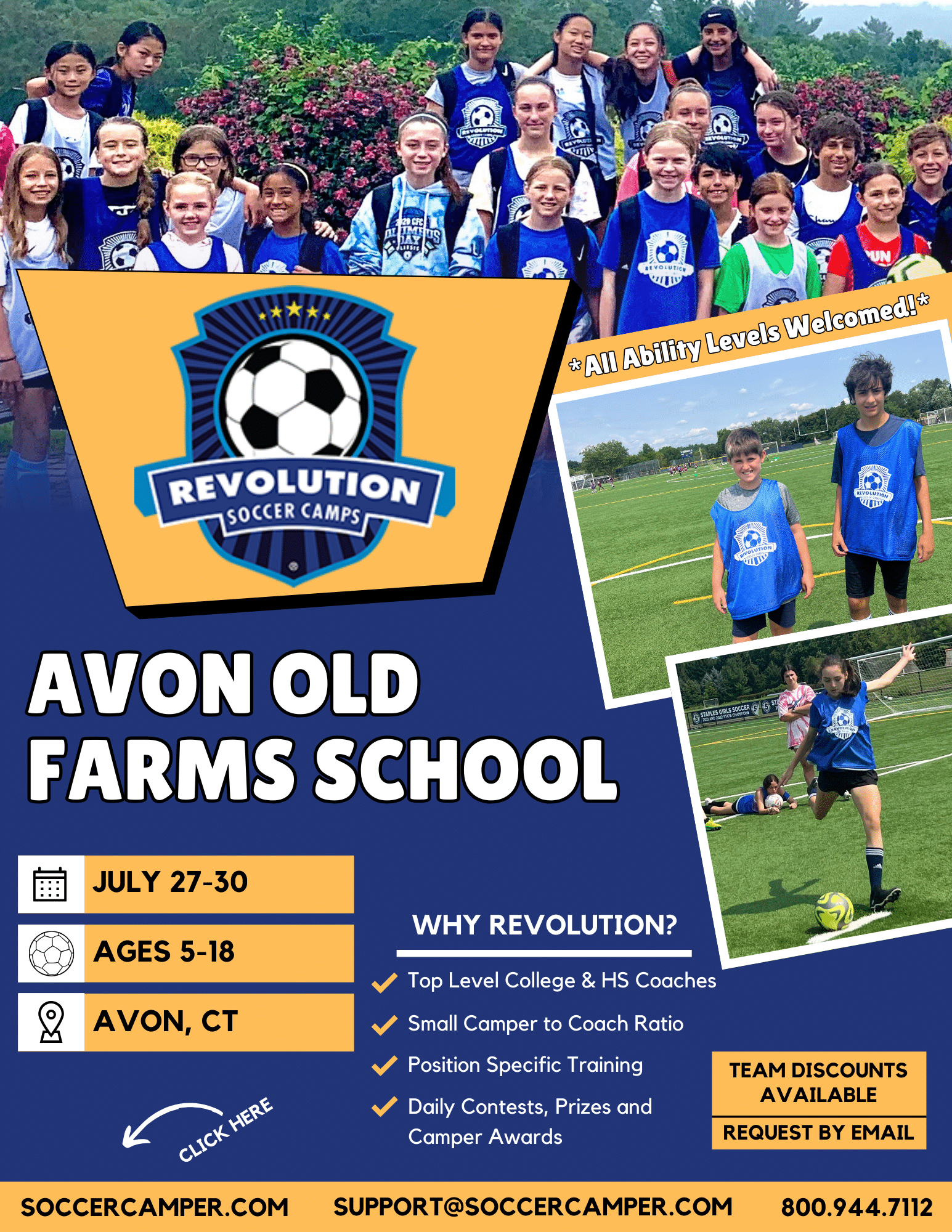 Revolution Soccer Camp is open to kids & teens ages 5 to 18. Campers will be grouped based on age and ability levels. Portions of the camp will be co-ed.