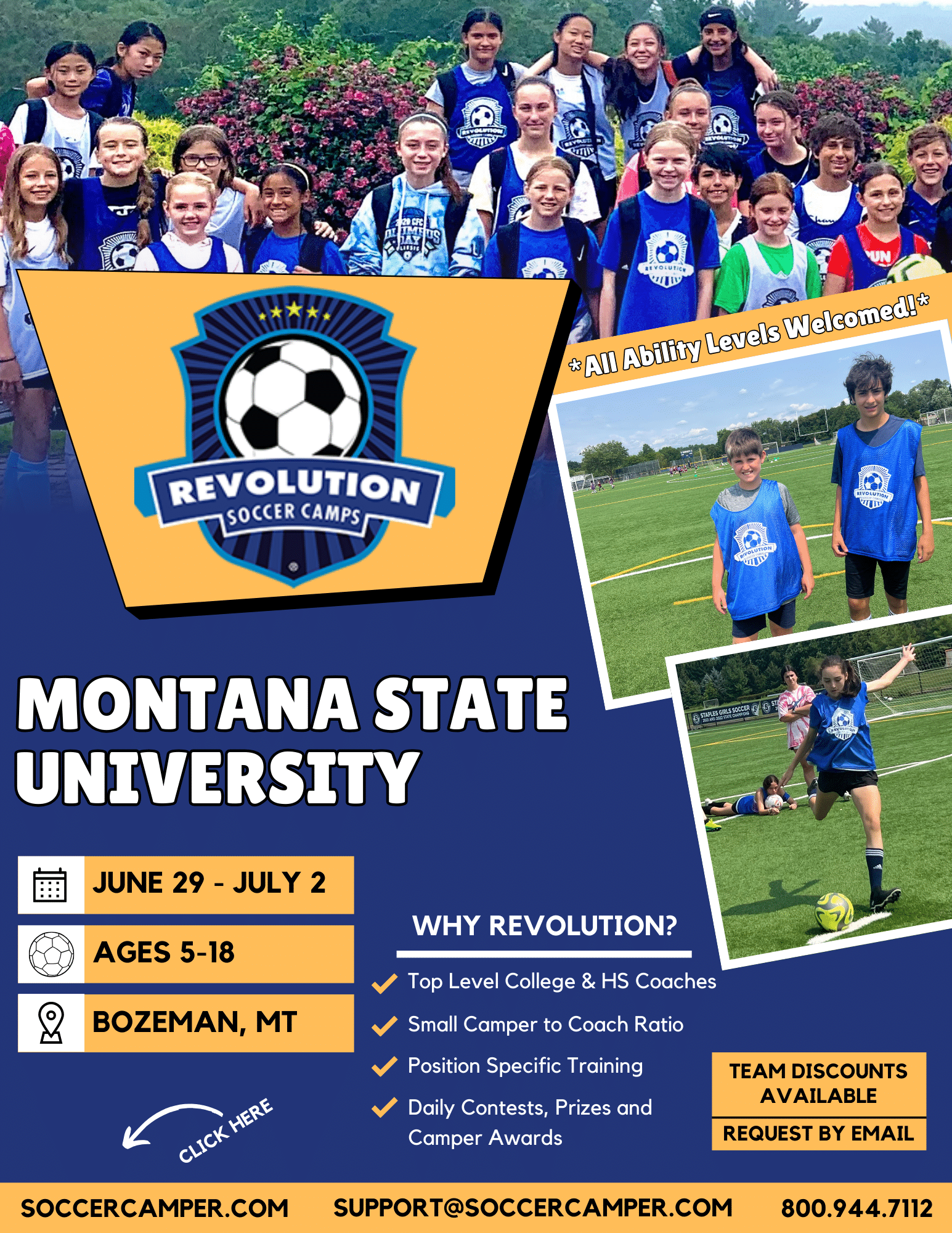 The Lambert Grass Fields, located on the beautiful Montana State University campus, are used for Intramural Sports, fitness, and recreation. We’re excited to host the Revolution Soccer Camps at Montana State University. Join us and have fun while improving your soccer skills this summer!