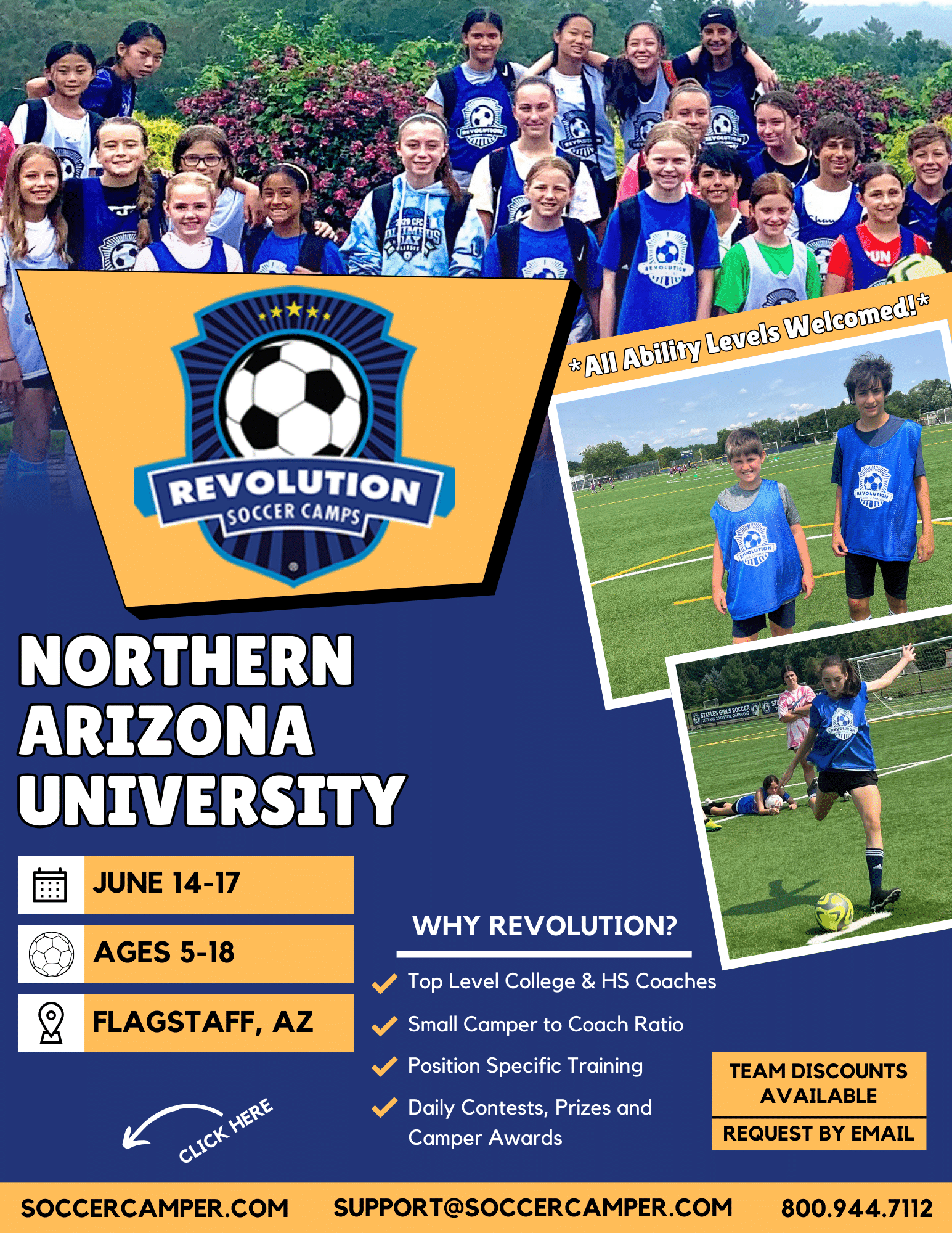 The Northern Arizona University South Campus Recreation Complex is a state-of the-art complex that features a variety of athletic fields and facilities that are used for Intramural Sports, fitness, and recreation. We’re excited to host the Revolution Soccer Camps at Northern Arizona University. Join us and have fun while improving your soccer skills!
