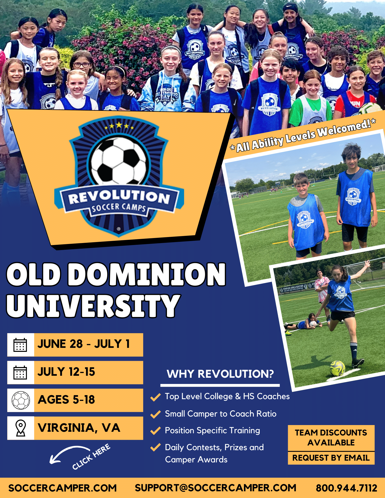 Revolution Soccer Camp is open to kids & teens ages 5 to 18. Campers will be grouped based on age and ability levels. Portions of the camp will be co-ed.
