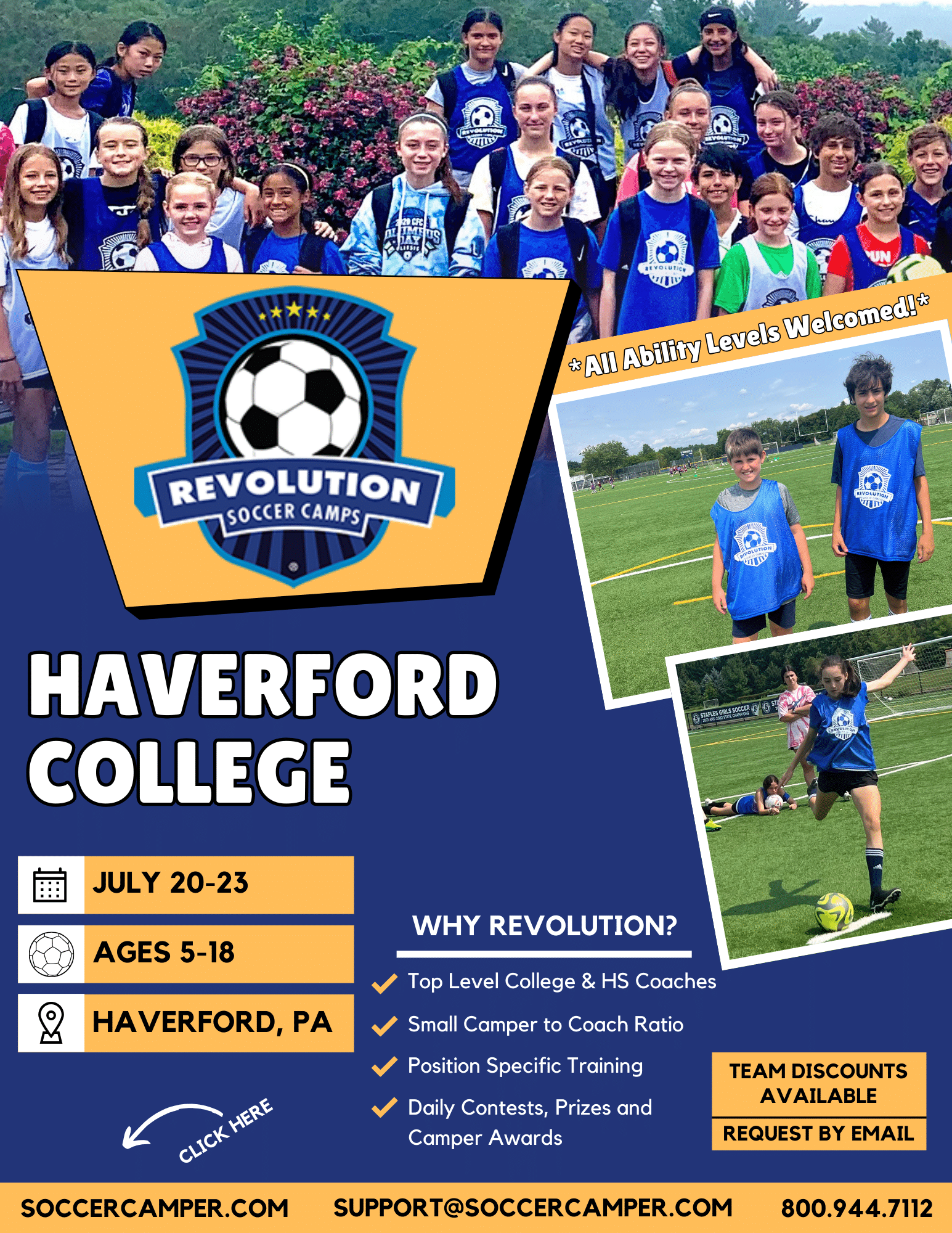Revolution Soccer Camp is open to kids & teens ages 5 to 18. Campers will be grouped based on age and ability levels. Portions of the camp will be co-ed.