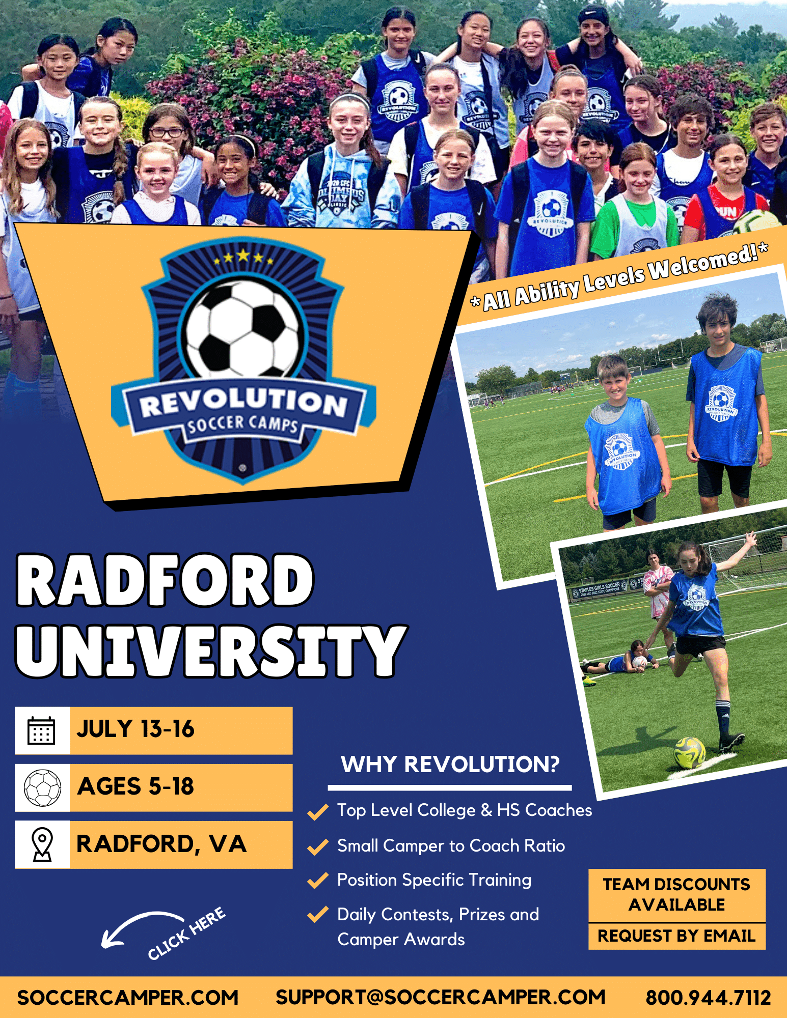 We’re excited to host the Revolution Soccer Camps at Radford University. Join us and improve your soccer skills this summer!
