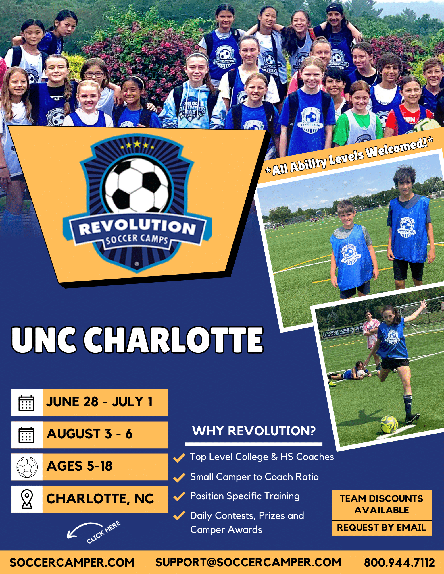 Revolution Soccer Camp is open to kids & teens ages 5 to 18. Campers will be grouped based on age and ability levels. Portions of the camp will be co-ed.
