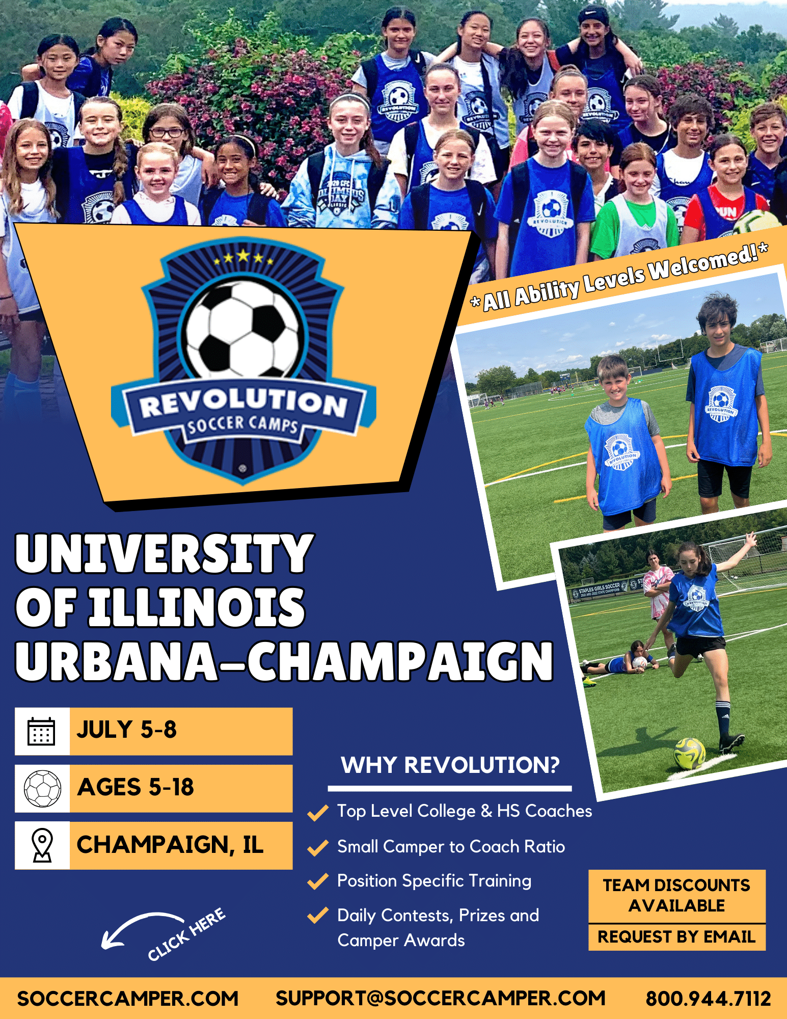 Revolution Soccer Camp is open to kids & teens ages 5 to 18. Campers will be grouped based on age and ability levels. Portions of the camp will be co-ed.