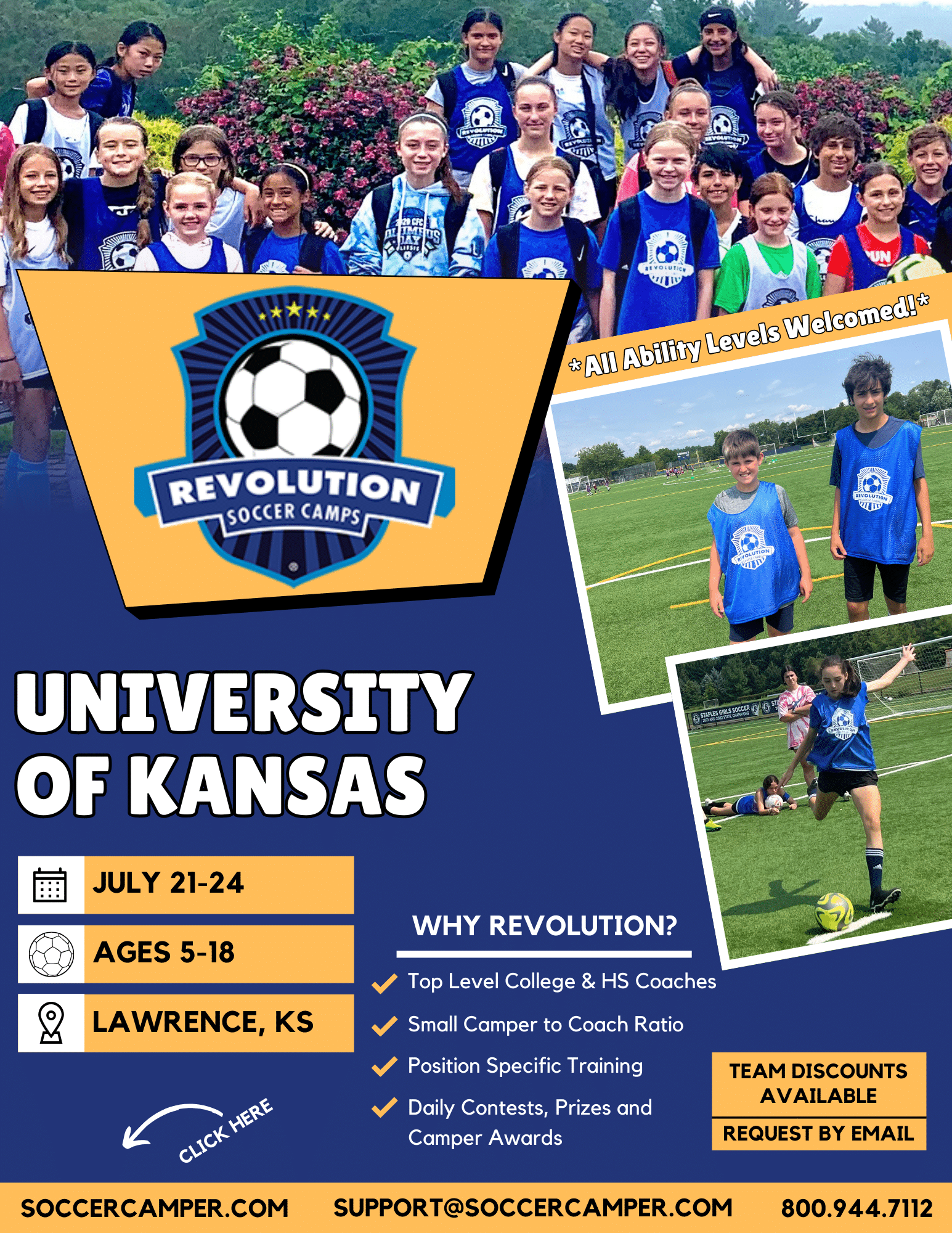 Central Field is the new artificial turf field located on the beautiful University of Kansas campus and is home to Jayhawk Club Sports Teams and Intramural Sports. We’re excited to host the Revolution Soccer Camps at University of Kansas. Join us and improve your soccer skills this summer!