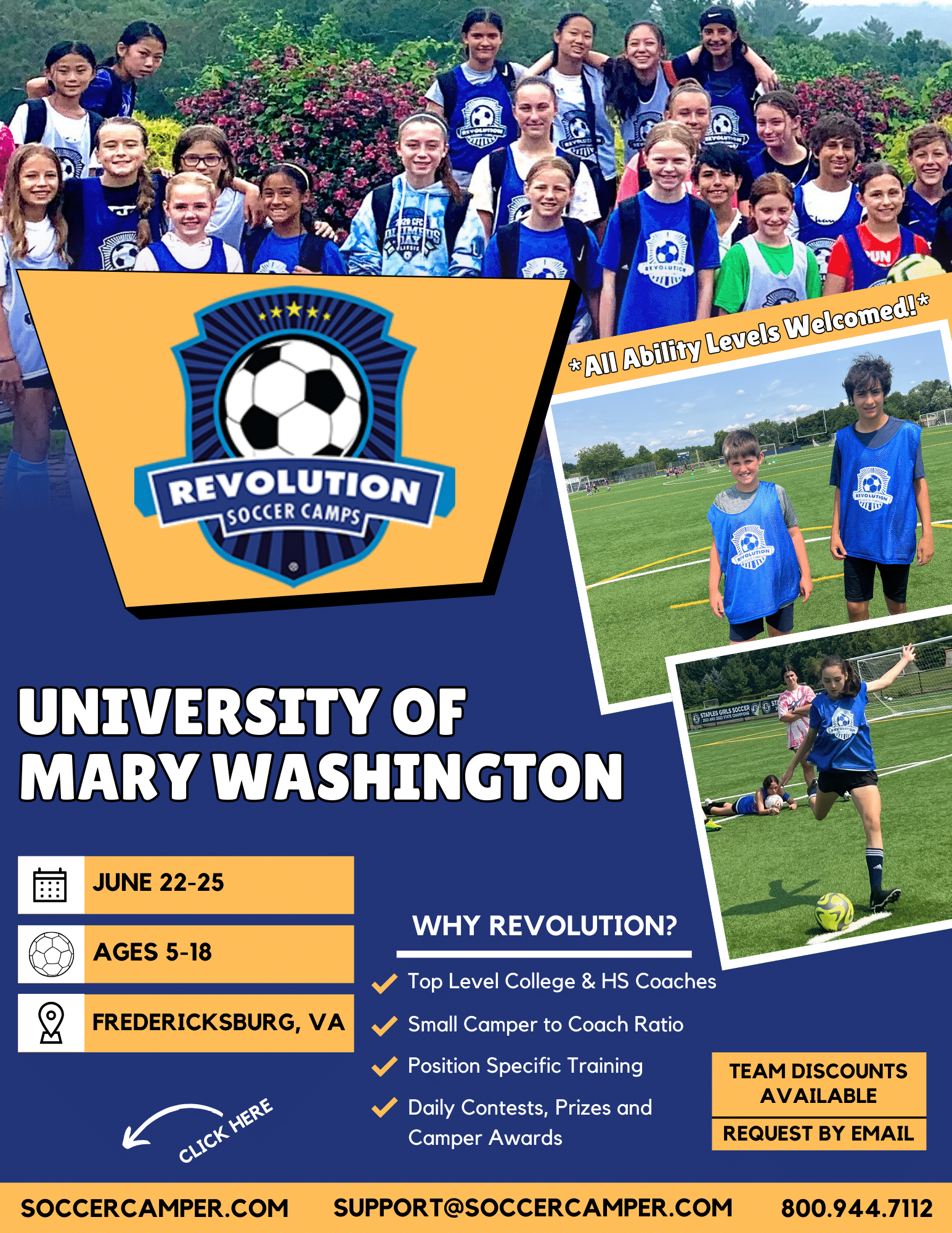 Revolution Soccer Camp is open to kids & teens ages 5 to 18. Campers will be grouped based on age and ability levels. Portions of the camp will be co-ed.