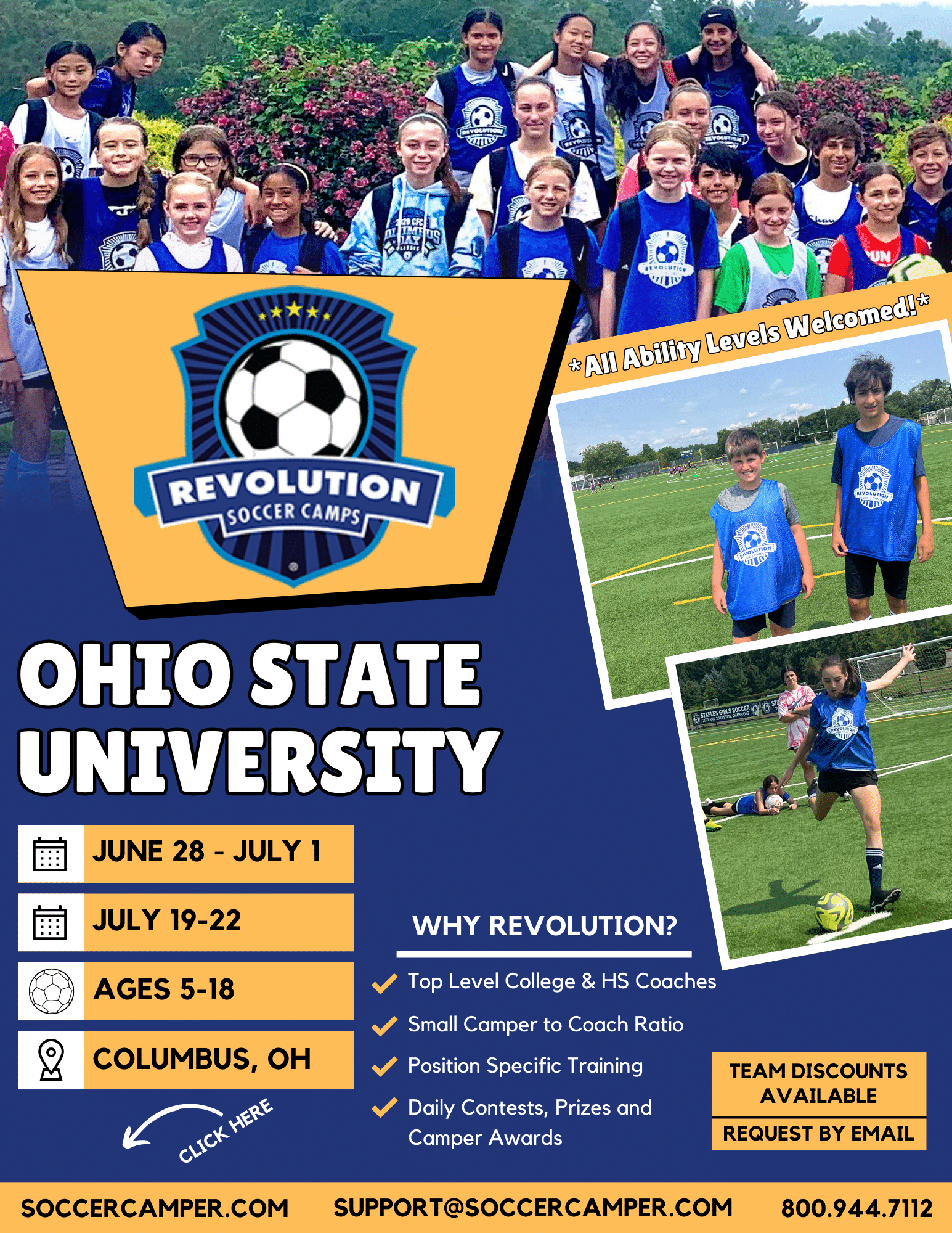 The Adventure Recreation Center is a state-of-the-art recreation facility on the West Campus of The Ohio State University. The ARC includes indoor turf fields and volleyball courts, as well as a variety of athletic facilities and amenities that are used for Intramural Sports, fitness, and recreation. We’re excited to host the Revolution Soccer Camps at The Ohio State University. Join us and have fun while improving your soccer skills!